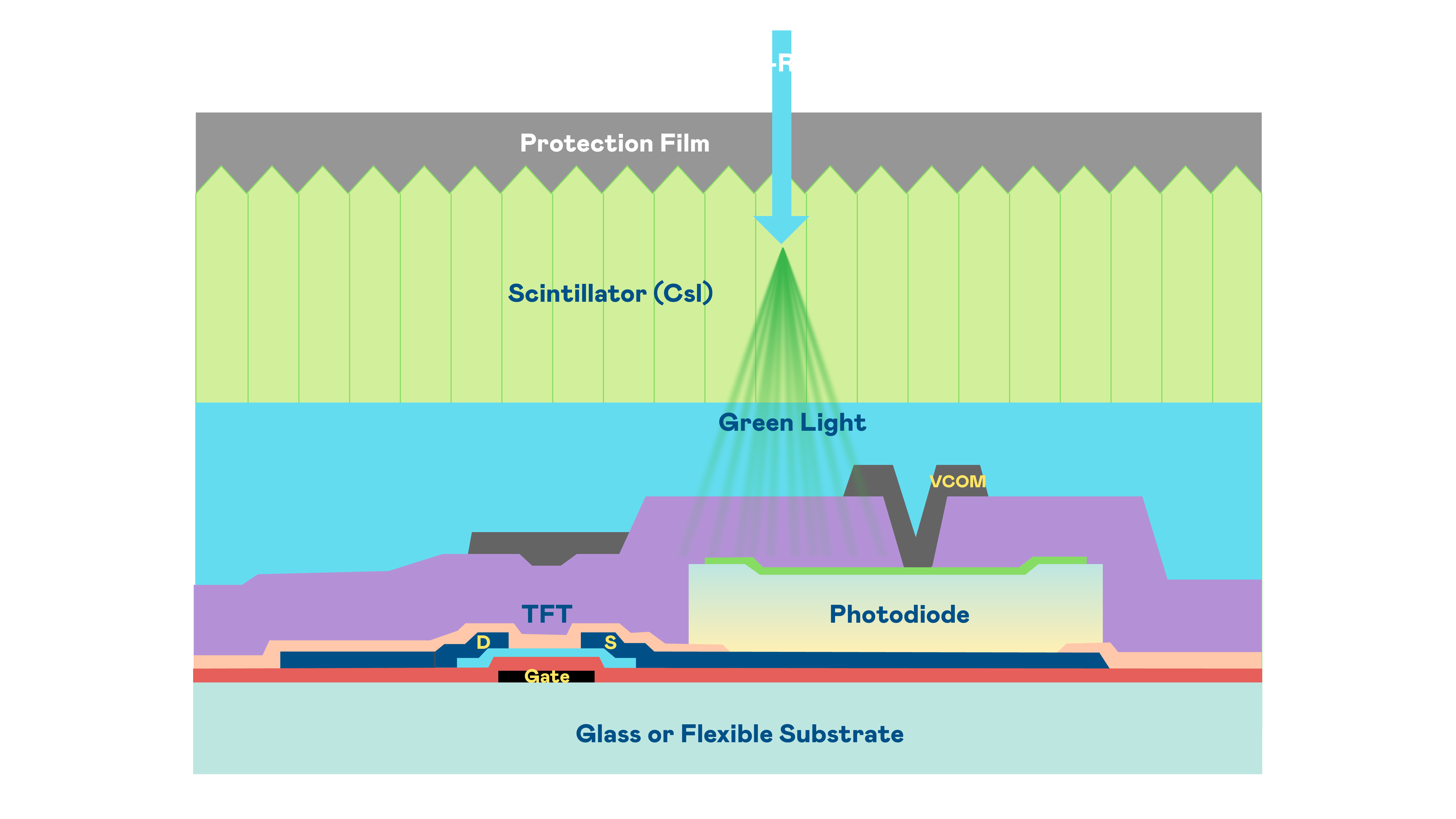 永利皇宫官网的X光影像感測陣列使用薄膜電晶體 (TFT) 作為每個像素的讀取開關,搭配光電二極體(Photodiode)的光電轉換元件,用以感測X光影像訊號。